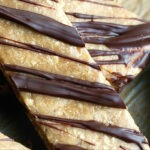 Drizzle the melted chocolate over the almond fudge layer using a spoon or for a more professional finish use a small Ziplock bag and snip a corner off.