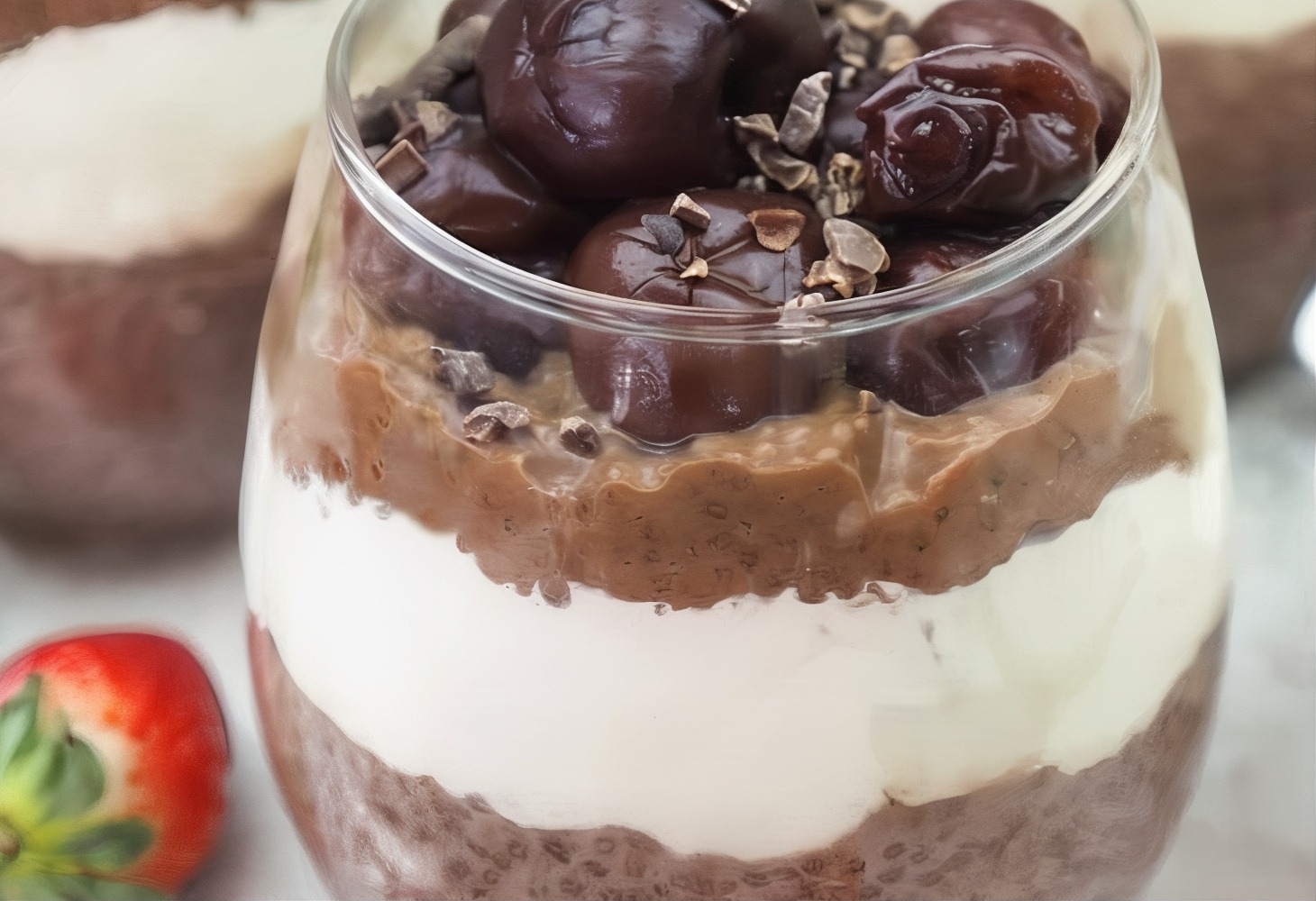 Layer the cherry chia pudding and the cream in 2 glasses or serving bowls. Cover and place in the fridge for 4 hours or overnight.