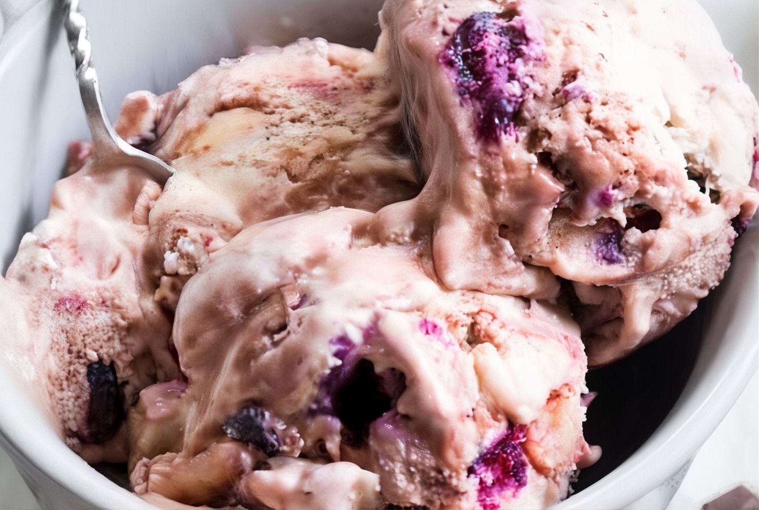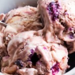 It’s a beautiful pinkish purple ice cream, that looks and tastes delicious. It’s rich, creamy and fruity, with bits of chocolate in every bite. It’s an egg free, no cook ice cream, that is super easy to make.
