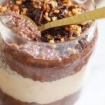- Whisk peanut butter into the yogurt until fully combinedOnce the chocolate chia is set, layer into 2 small glasses and garnish with salted peanuts, granola, chocolate chips or chosen toppings to serve.