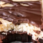 - Place chocolate chips and coconut oil in small dish and microwave with 15 second bursts stirring between each one until melted and smooth.Or use double boiler method - (pot of boiling water with a bowl resting on top) melt the chocolate chips and the coconut oil together.Once melted, drizzle the melted chocolate/coconut oil over the top. Put in the freezer for 10 minutes to set and then cut into 16-20 squares to serve!Store leftovers in either the freezer or refrigerator. The freezer will give it more of a candy bar consistency while the fridge will make it more like fudge.Recipe Notes*I refrigerated my can of coconut milk so the water and cream separate, then discarded half the water and blended the rest together for a thick, creamy coconut milk.