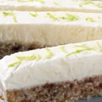 - Place coconut oil in a small dish and microwave with 10 second bursts stirring between each one until melted and smooth.Or use double boiler method - (pot of boiling water with a bowl resting on top) melt the coconut oil.Add melted coconut oil to a food processor along with all other ingredients and process until smooth. Should be a thick spreadable mixture.Add milk if too thick, coconut flour or protein powder if too thin.Taste test and add more lime or honey if you think it needs it.Spread on top of chilled slice and place pan back into the freezer for 30 minutes, or until the frosting has set.Remove pan from freezer and lift the parchment paper to remove the bars. Using a sharp knife, cut into 8-10 bars or more smaller squares. Store in an airtight container in freezer for up to three monthsServe semi thawed with finely grated lime zest to finish. ✨