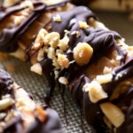- Place chocolate chips and coconut oil in small dish and microwave with 20 second bursts stirring between each one until melted and smooth.Or use double boiler method - (pot of boiling water with a bowl resting on top) melt the chocolate chips and the coconut oil together.Once melted, spoon or drizzle melted chocolate over each piece, covering the top.Return to the freezer for 30–60 minutes until fully set.Enjoy straight from the freezer or let sit for 2–3 minutes to soften slightly.Store in an airtight container in the freezer for up to 2 weeks.