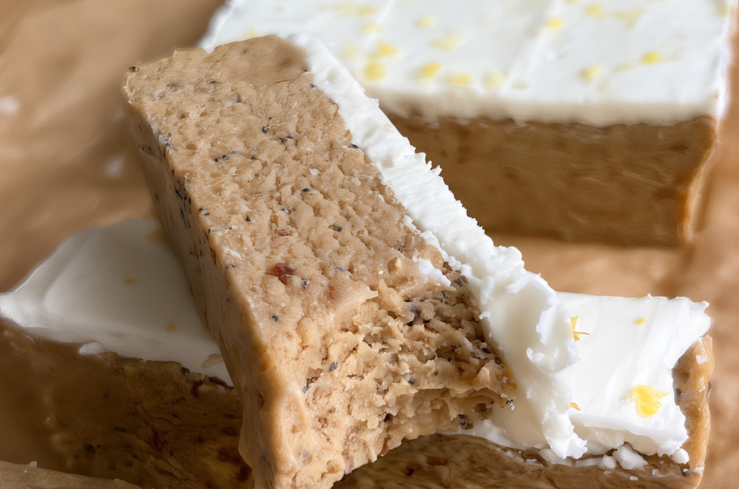 Keyword clean eating breakfast, clean eating dessert or snack, creamy lemon protein bars no bake, healthy no bake lemon protein bars, lemon frosted protein cake bars, lemon protein bars no bake