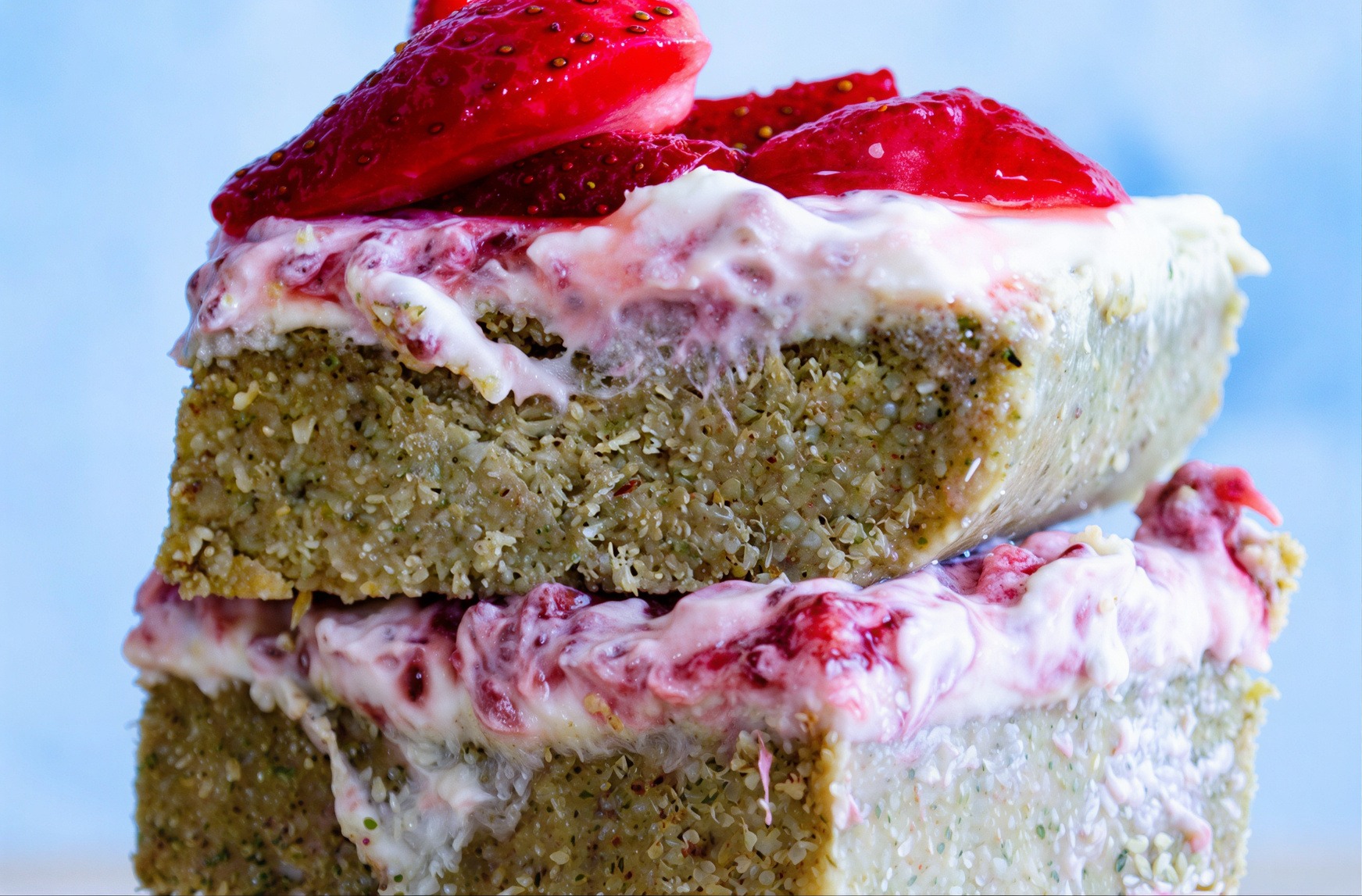 - In a bowl, whisk yogurt, protein powder, blended strawberries, sweetener, and vanilla until smooth.Pour over the crust and smooth the top.Freeze for 3-4 hours, or until firm.Slice into 8-10 bars or more smaller squares;Store in an airtight container in the fridge for up to 1 week or freezer for up to 3 months.
