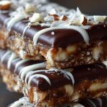 - Melt the extra white chocolate drizzle as above in a microwave or over a double boiler. Once melted drizzle over the bars with a spoon to add extra decoration as shown in recipe image. Sprinkle with chopped almonds.Refrigerate for 1–2 hours, or until firm then slice into 10 bars or more smaller squares. Store in the fridge for up to 1 week or freezer for up to 3 months.