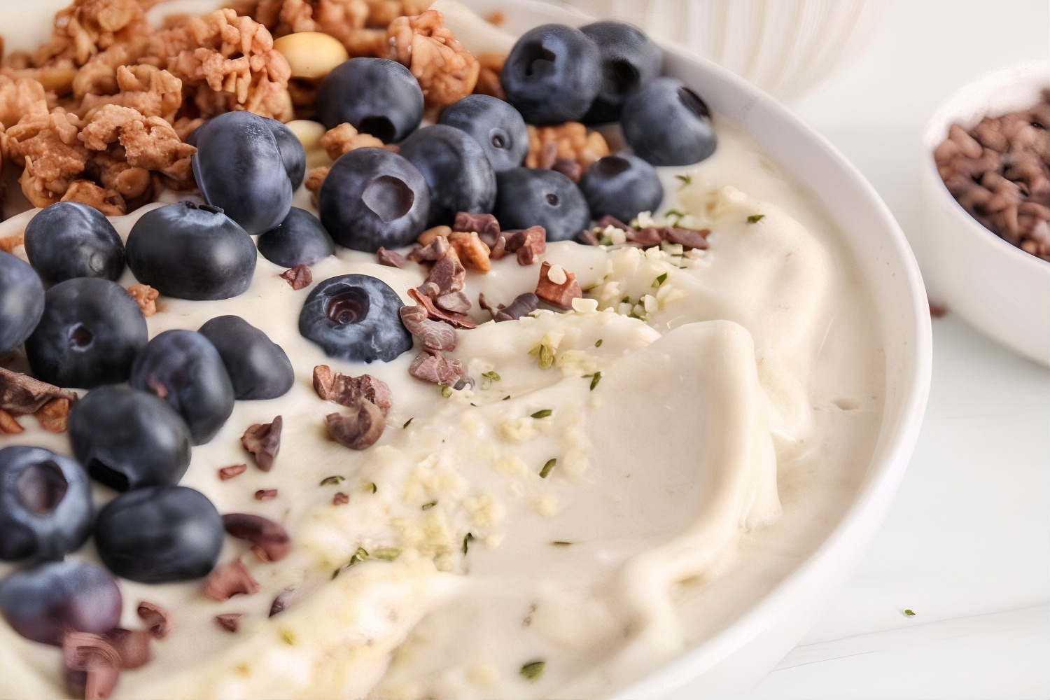 Simply combine frozen fruit with a splash of milk in your blender and blend until smooth. Top with whatever fruits or nuts or even granola – then grab your spoon and get ready for a bowl of delightfully refreshing goodness! Not only that but it’s packed full of vitamins and minerals which will give you the energy!
