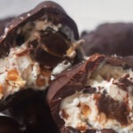 - Place chocolate chips and coconut oil in small dish and microwave with 20 second bursts stirring between each one until melted and smooth.Or use double boiler method - (pot of boiling water with a bowl resting on top) melt the chocolate chips and the coconut oil together.Working quickly, using two forks, dip one cluster at a time into the bowl of melted chocolate until it is fully coated. Lift from the bowl of chocolate and let any excess drip off, then place it onto a tray lined with baking paper. Repeat with the remaining bites.Or hold each one with a fork over the melted chocolate and spoon it over letting the excess drip back into the bowl. Return to the baking sheet or plate and top with a sprinkle of chopped peanuts.Place the chocolate covered clusters back in the freezer until the chocolate has hardened, before moving them to an air-tight container for long term storage.These need to be stored in the freezer, however I recommend letting them thaw at room temp for 5 minutes or so before enjoying for the creamiest consistency and to avoid that icy texture.